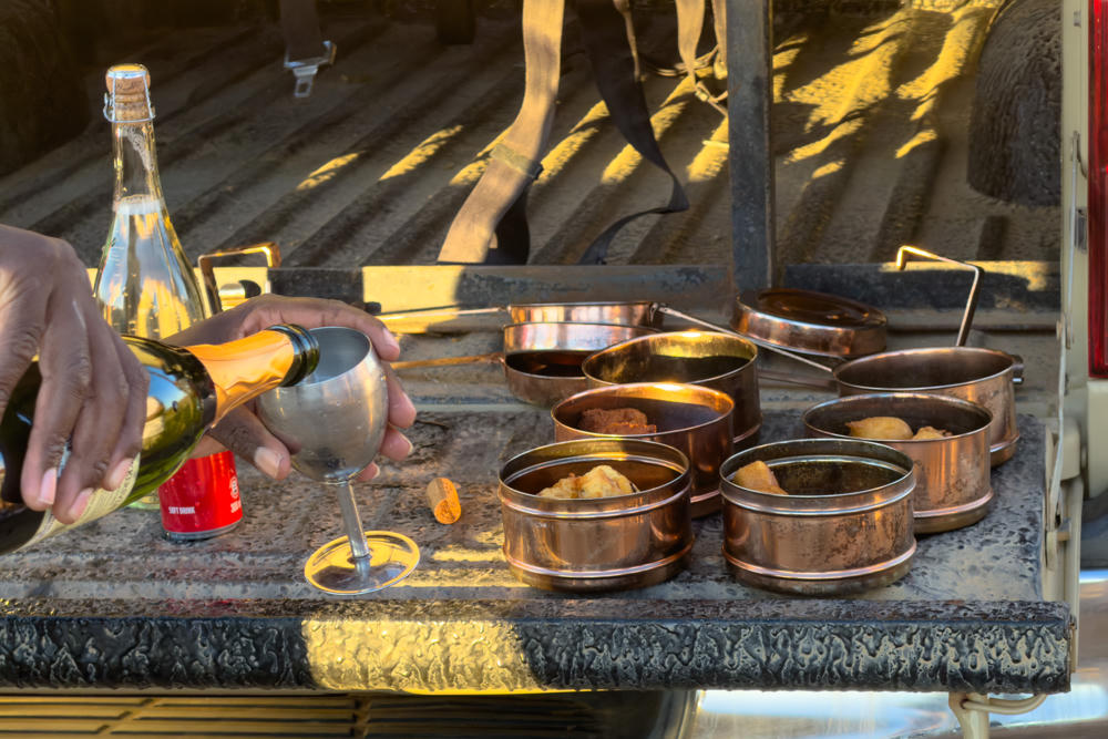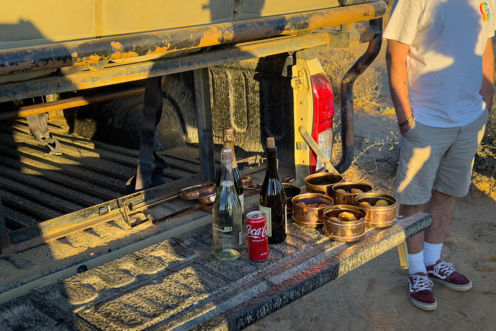 Having seen most of the animals that we would for this evening, we took a moment to step out of the vehicle (safely away from any of the dangerous animals) for a light snack and glass of wine before heading back to the local watering hole for the night.