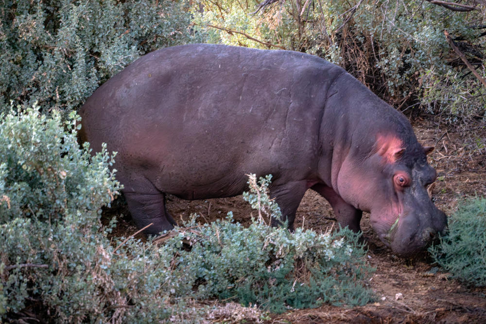 Oh, silly … when I said watering hole, I meant literally watering hole, where we would find our last animal for the evening. Hippos spend most of the daylight hours underwater. They surface every 5-7 minutes to breathe and manage to do so without losing sleep. As night falls, they emerge to graze overnight. We timed our visit for the twilight hours when they are just coming out of the water.