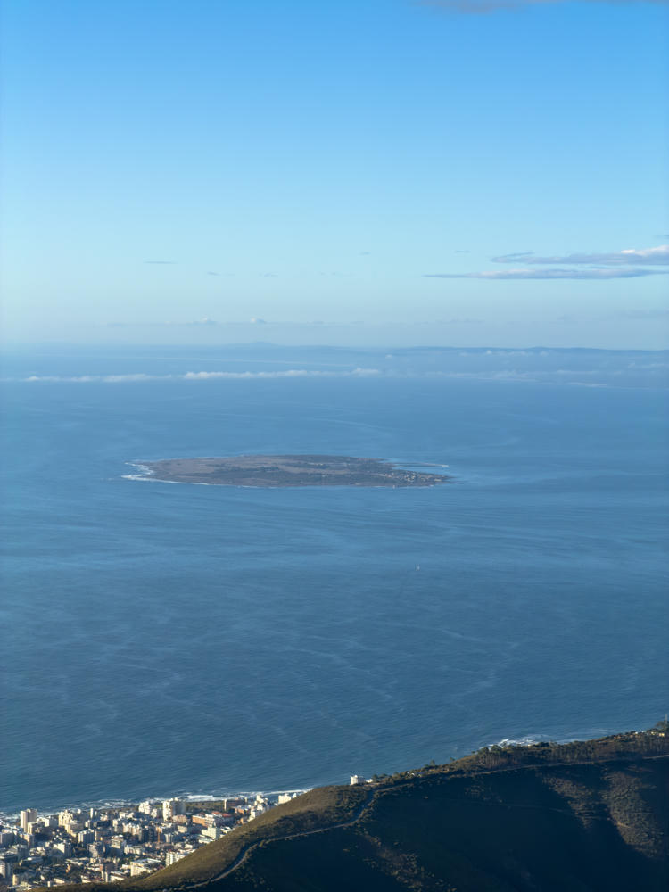 Looking to the north from Table Mountain, we can see the infamous Robben Island. Nelson Mandela was held here along with many other political prisoners for many years.
